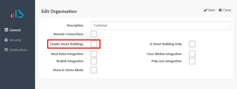 In the System > Configuration screen, edit the Organisation you wish to enable Smart Building for, and tick the box Enable Smart Buildings. Click Save.