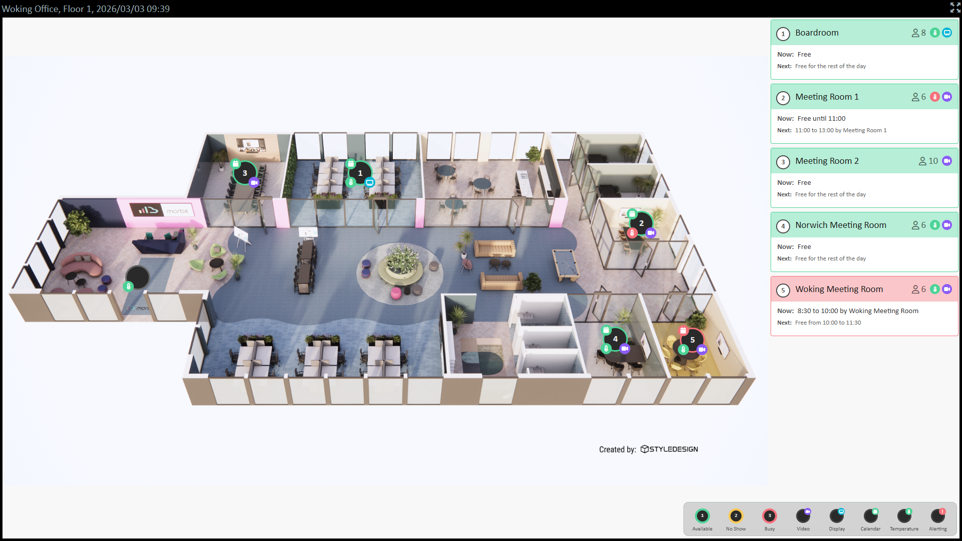 • Wallboards of the Floor Plans showing Meeting Room status including 'Now and Next' bookings