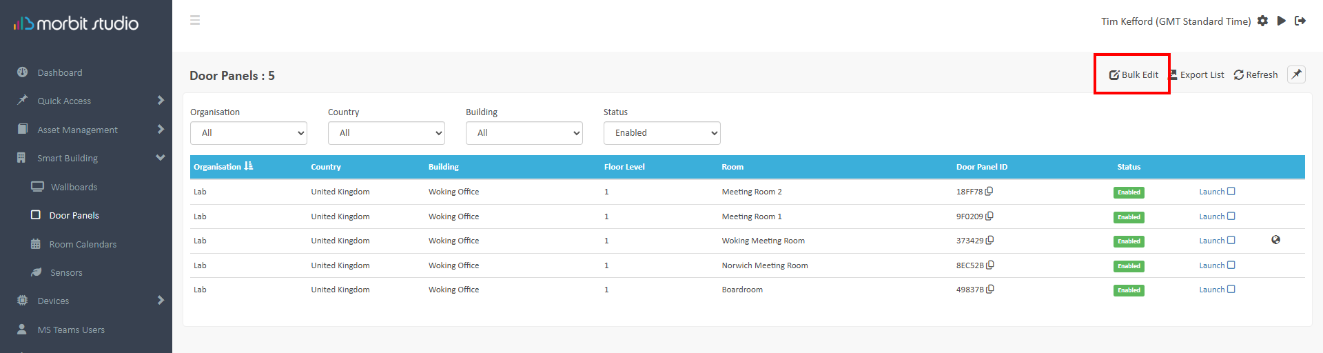 Navigate to Smart Building > Wallboards. From here you can filter the view via the Organisation, Country or Building. At the end of the rows of listed Floor Plans, you can choose to Launch the Wallboard to a new browser tab or Copy the Wallboard URL for sharing.