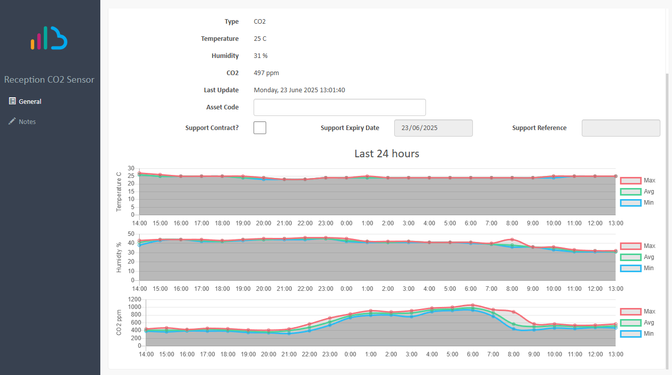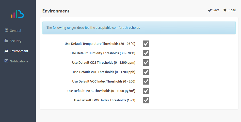 The system has been set up to work to a default range of values for environmental data as recommended by various industry bodies (such as the EU standard EN 15251:2007). These ranges are set to: