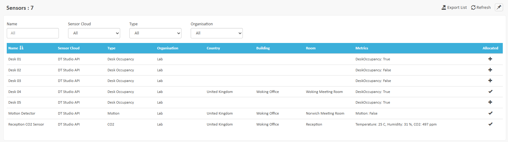 To allocate a sensor to a Room, simply click on the relevant sensor and click the '+' allocate icon at the right-side of the row entry. You can now assign this to the relevant room space.