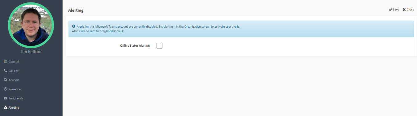 Consideration should be given to enabling this alerting. For example, if the user is logged into a laptop or mobile phone then energy saving methods may inadvertently put the user offline and trigger an alert event.