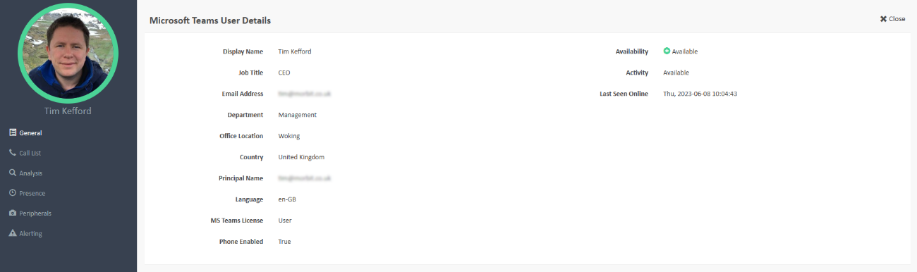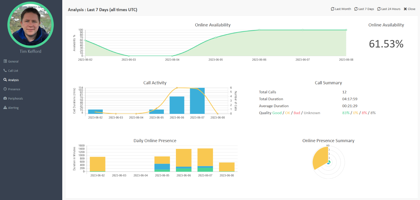 - Availability – how long has the user been online (network), shown as a graph and percentage of timeframe selected.