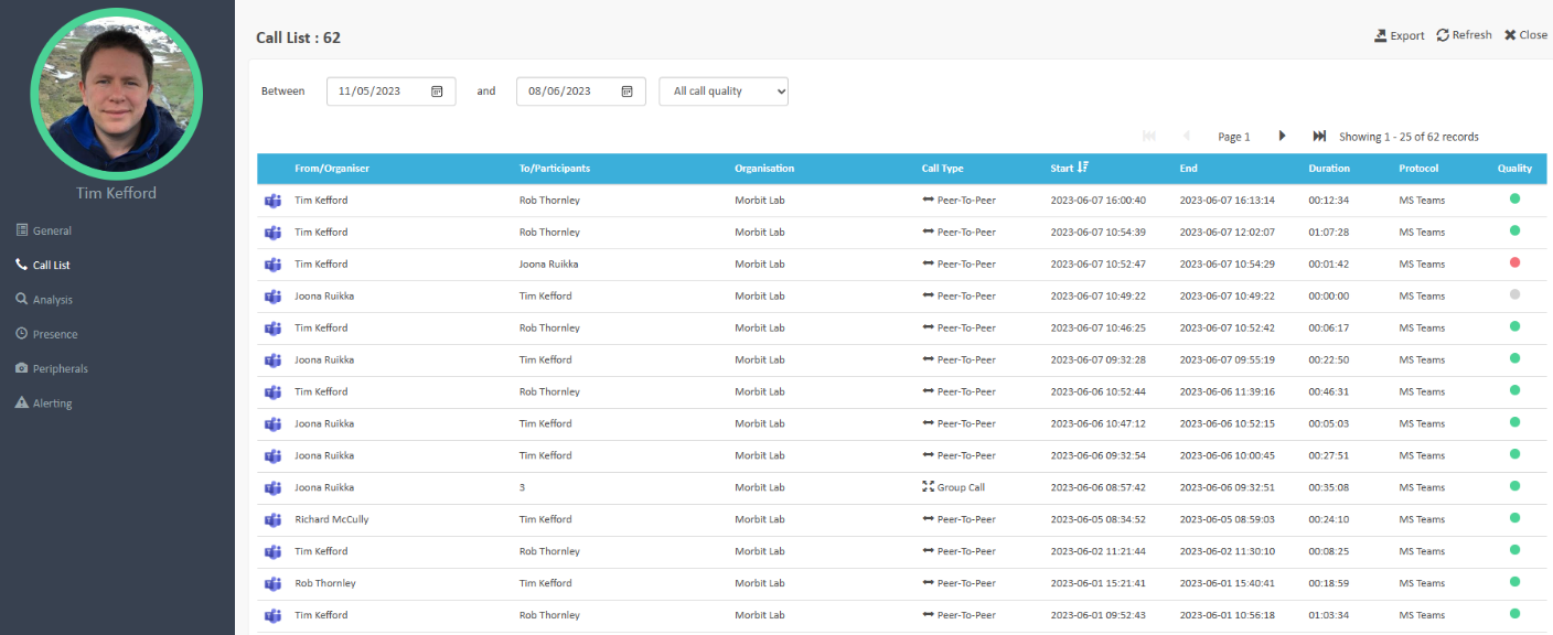 - Call Quality – of the calls made, what are the ratio of Good, Ok and Bad calls with regards to rated quality.