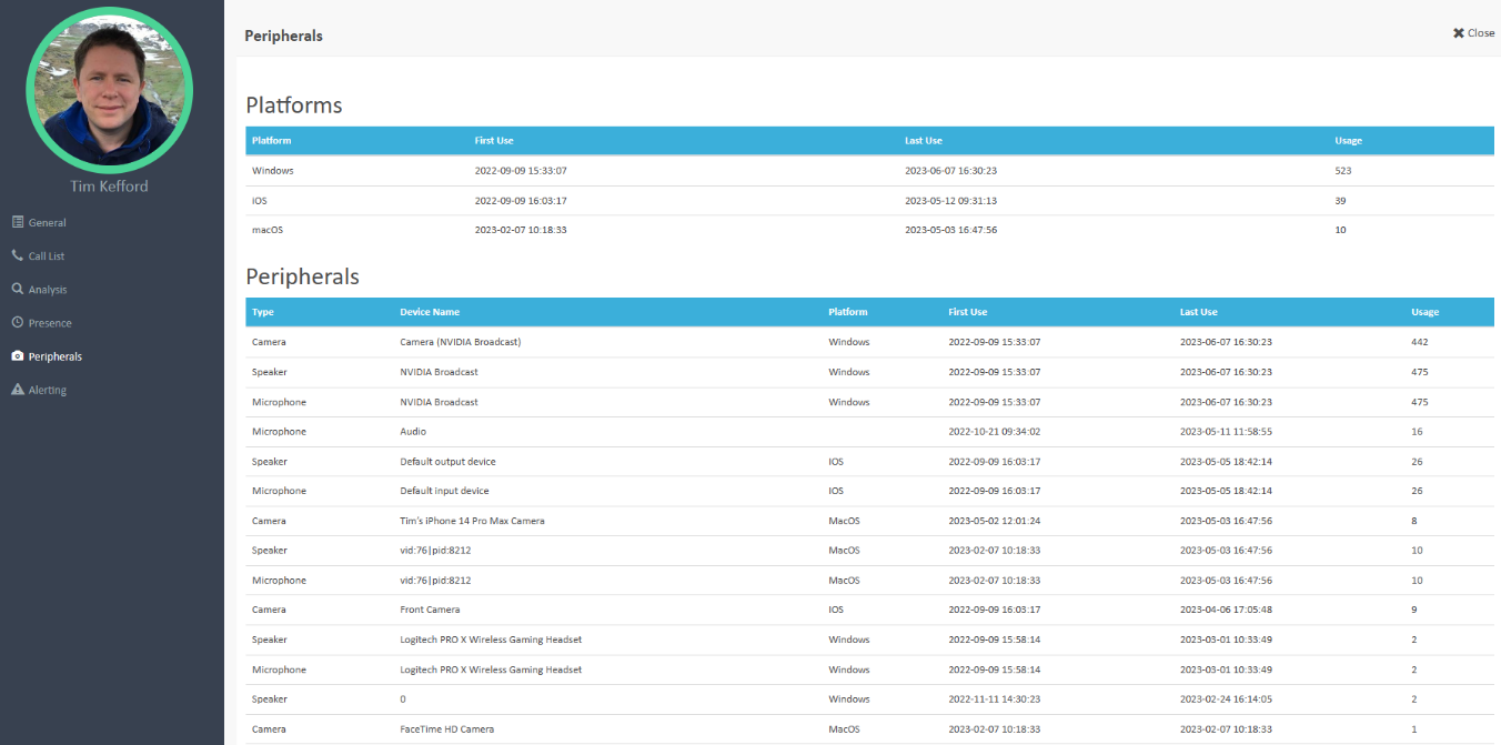 Reporting on the used peripherals and device operations systems used (platforms), can be viewed in the Peripherals section. The peripheral types displayed are: