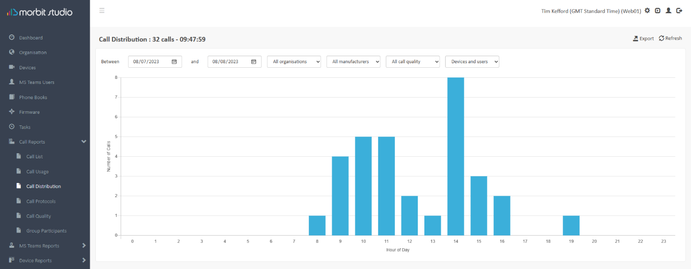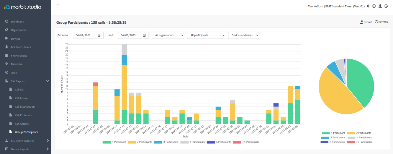 A visual graph to report on the participant sizes of a group call and allowing for an understanding of the scale of calls being undertaken. This data can be exported via the Export button.