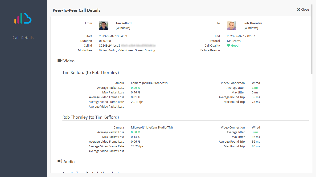 For the Call Type column, a Peer-To-Peer call is when Participant A calls Participant B only. Whereas the definition of a Group Call is one where the call is hosted on the video service, and we receive call metrics for all participants from that service (rather than off the Devices). This is typically when a meeting is scheduled, or a peer-to-peer call adds a third participant into the meeting, it’s re-established on the hosting platform.