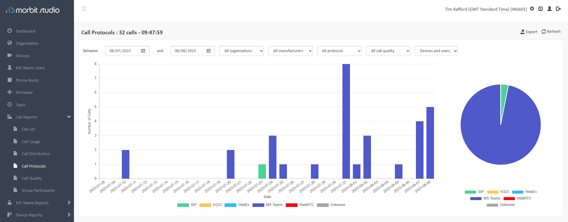 A view of the call protocols that are in use on video calls. Filters are provided to enable you to drill-down into the data. This data can be exported via the Export button.