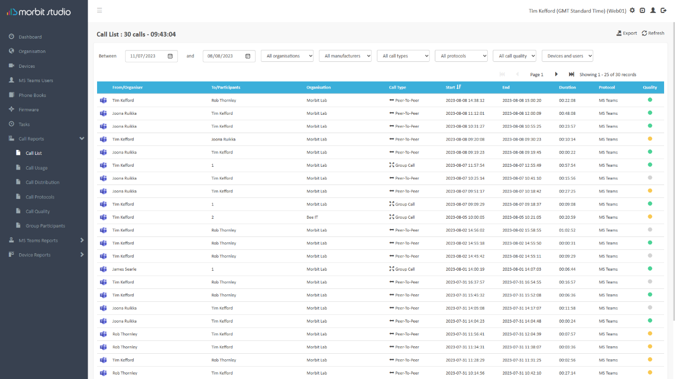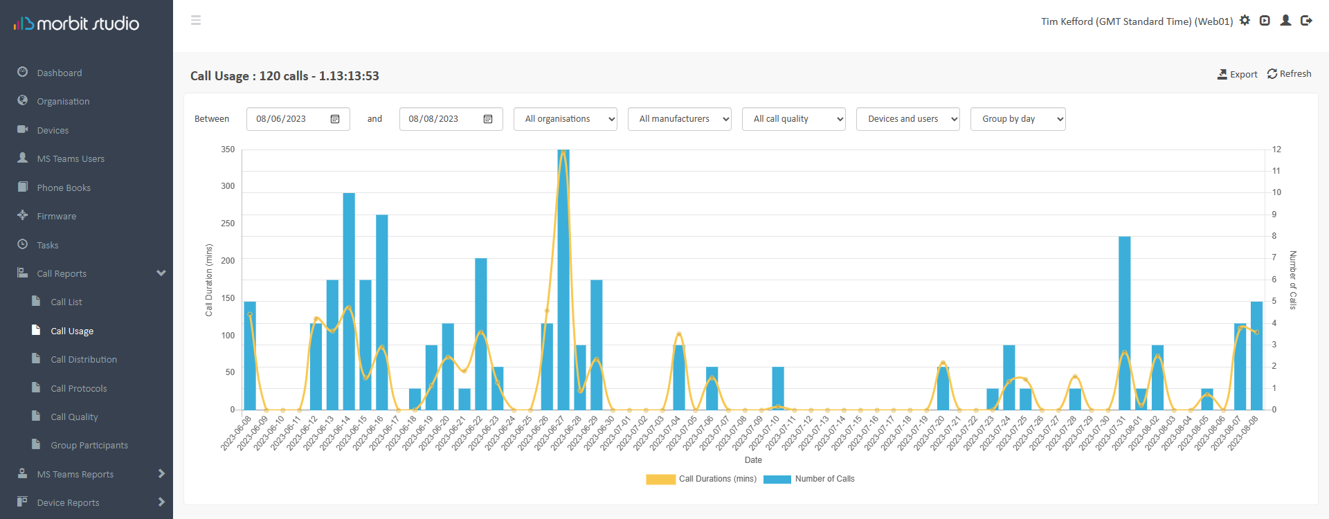 A customisable view of the numbers of total calls made by the Devices and the total call duration, broken down by day. The report helps gain an understanding of video usage over time. Filters are provided to enable you to drill-down into the data.