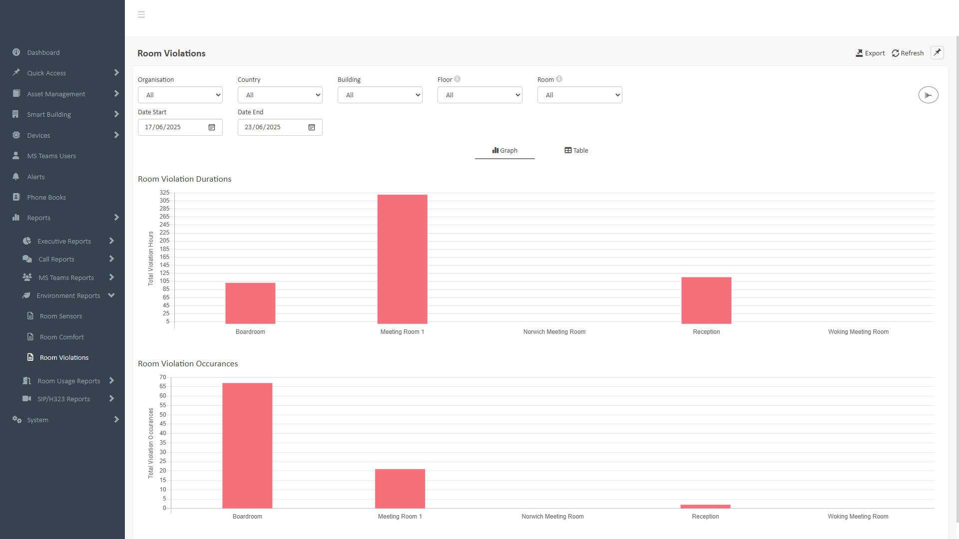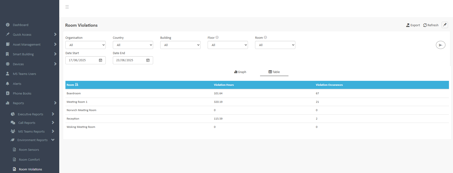 This report shows the total amount of hours and occurrences in violation that a Meeting Room was found to be exceeding the recommended environmental values for comfortable and healthy use. Meeting Rooms will many Violations should be checked for improvements.