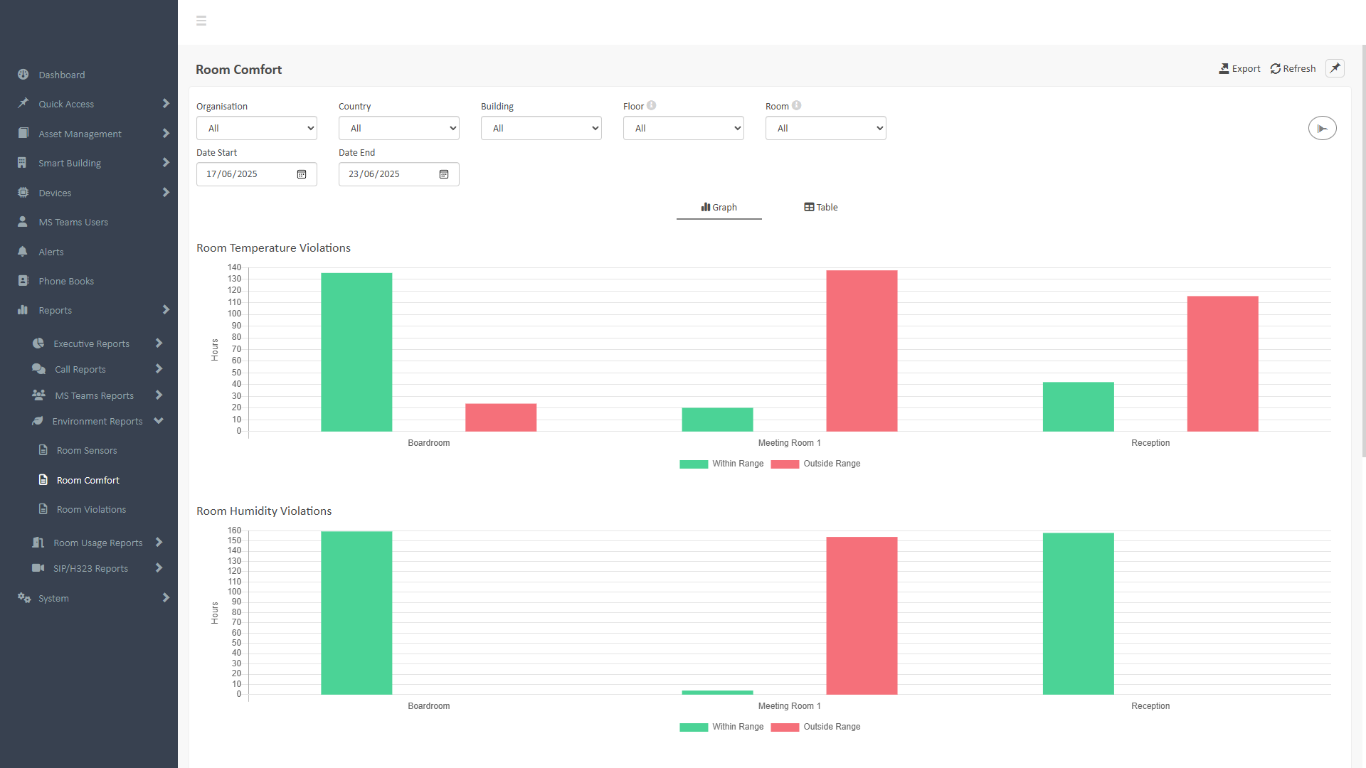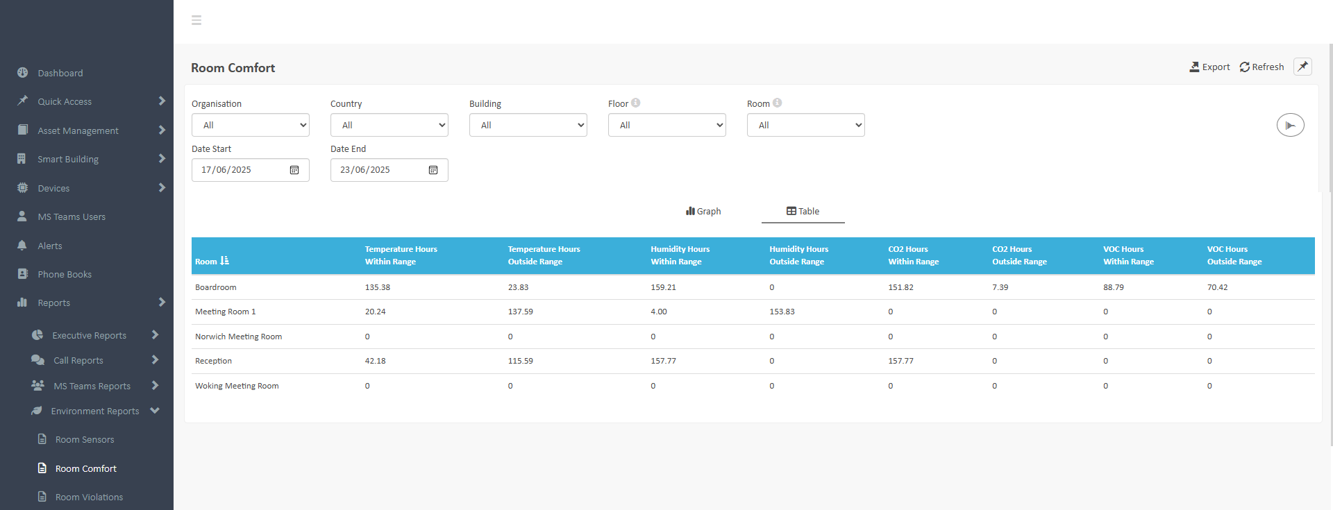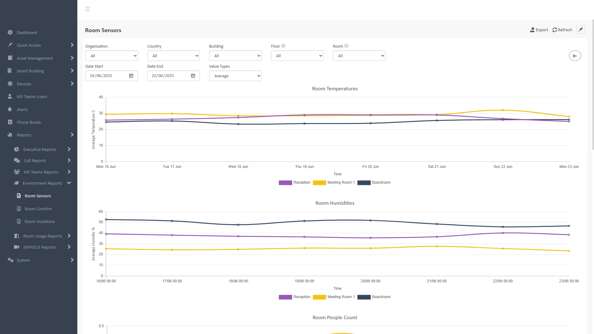 A compilation report of all the sensor metrics recorded in your environment. This can be filtered to specific dates and office buildings, floors or rooms.
