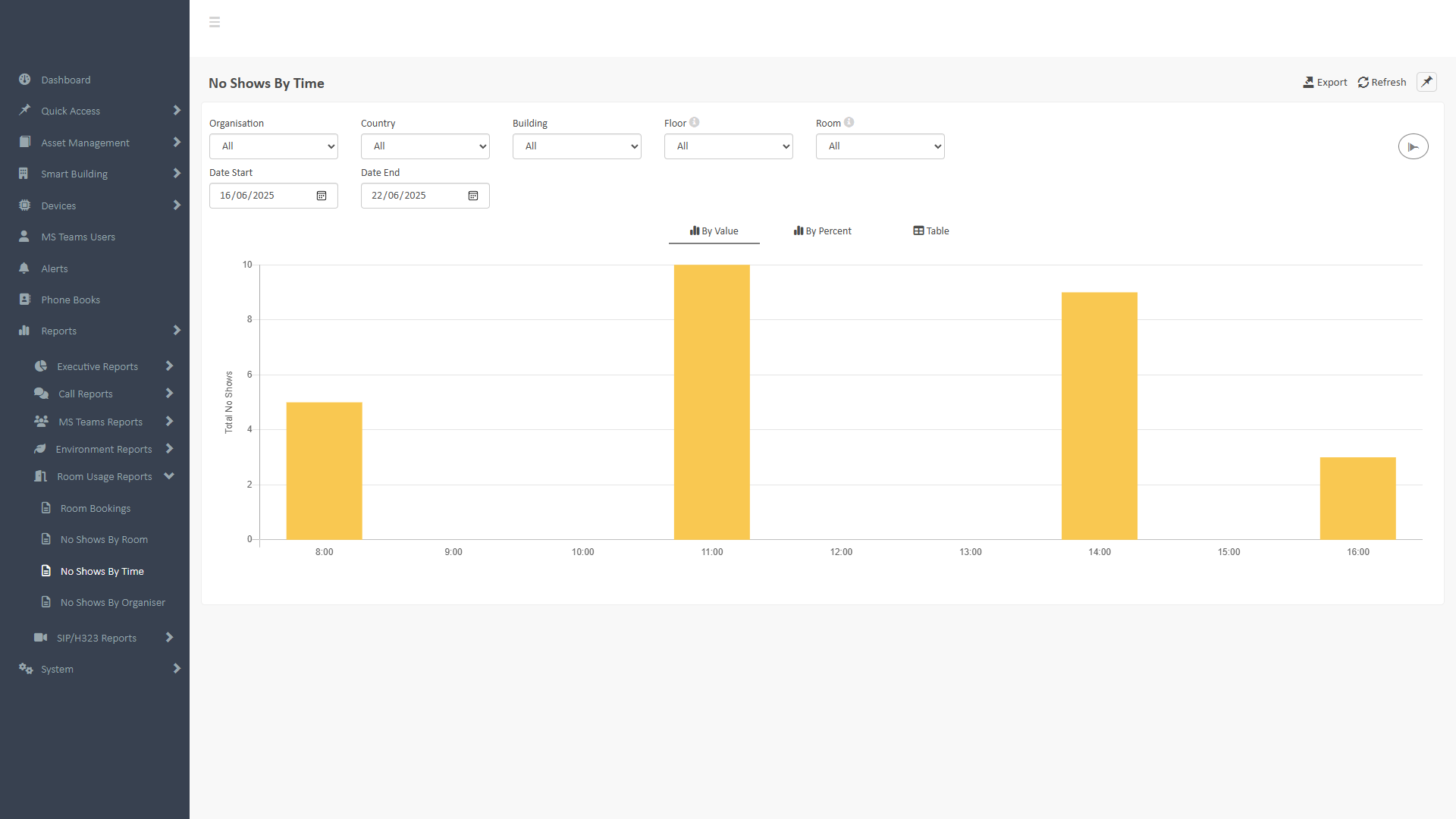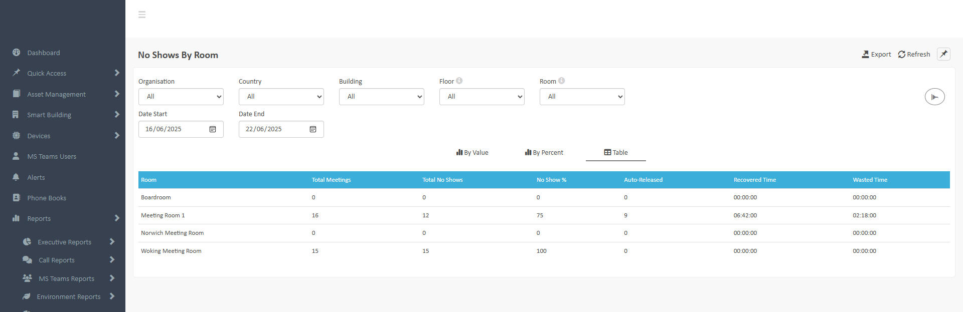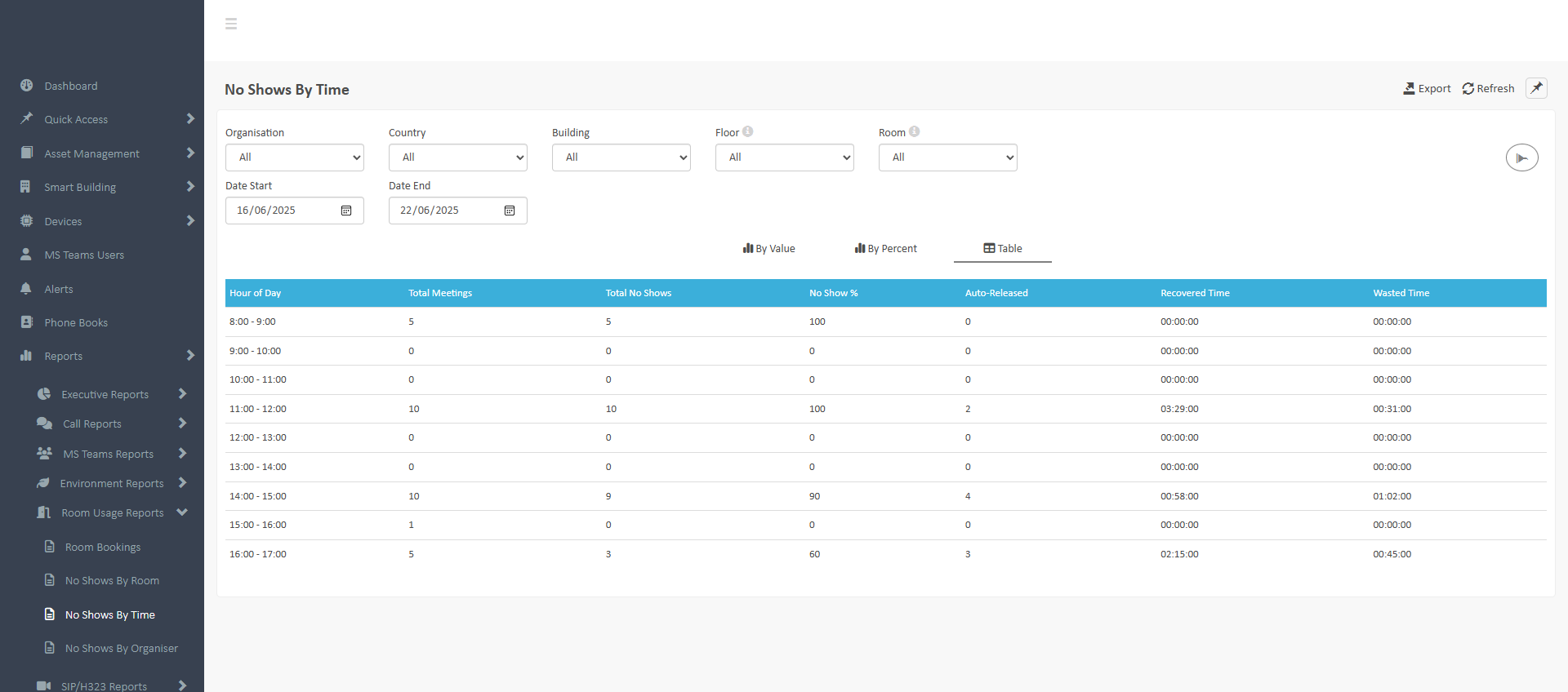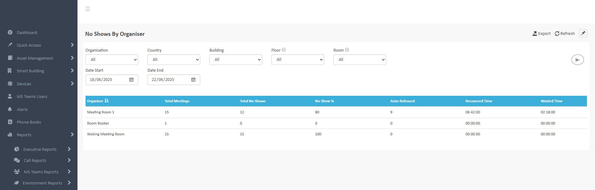 The data in this report shows the meeting room 'No Show' events within defined time periods per Room.