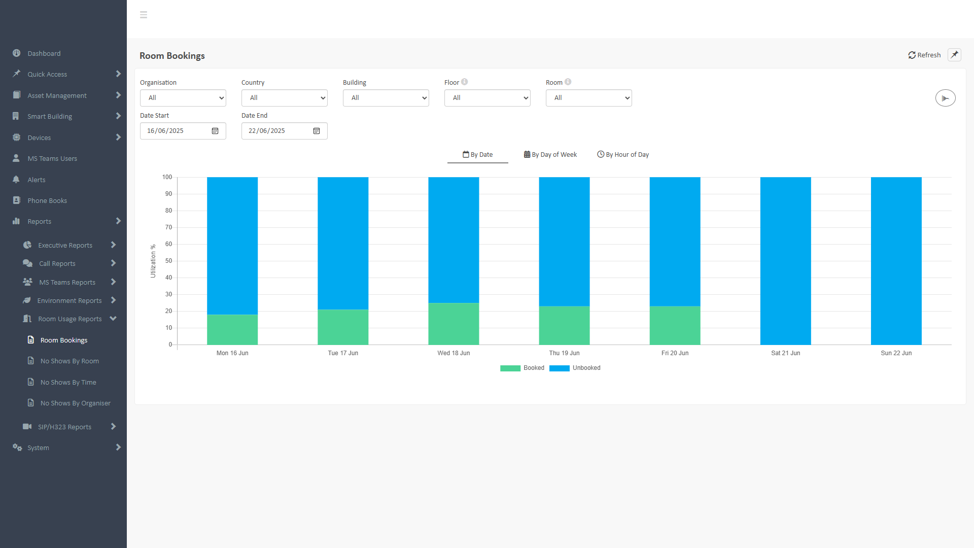 The data in this report shows the meeting room utilisation within defined time periods. The values are either Booked or Unbooked and shown as a percentage.