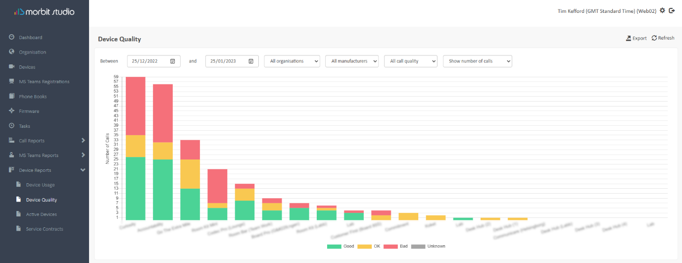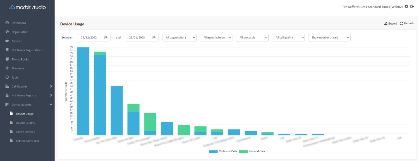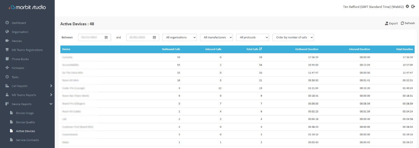 A view of the number of calls (inbound and outbound) and duration per Device of each one being monitored. Filters are provided to enable you to drill-down into the data. This data can be exported via the Export button.